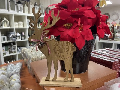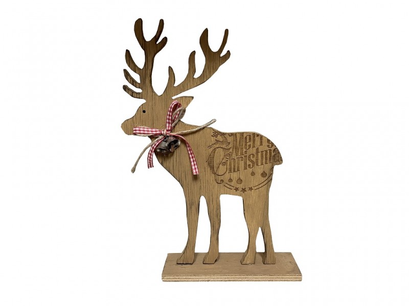 - Dekoracja jest wykonana z drewna i posiada dwie wstążki (z juty oraz materiałowa w czerwono-białą kratkę) i dwametalowe dzwonki. Na tylnej części renifera jest widoczny grawer "MERRY CHRISTMAS".